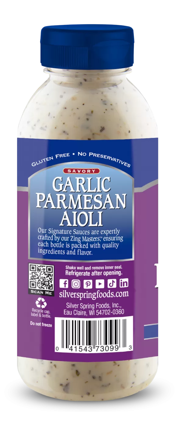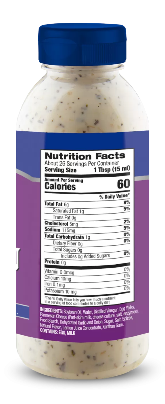Soybean Oil, Water, Distilled Vinegar, Egg Yolks, Parmesan Cheese (Part-skim milk, cheese culture, salt, enzymes), Food Starch, Dehydrated Garlic and Onion, Sugar, Salt, Spices, Natural Flavor, Lemon Juice Concentrate, Xanthan Gum. CONTAINS: EGG, MILK