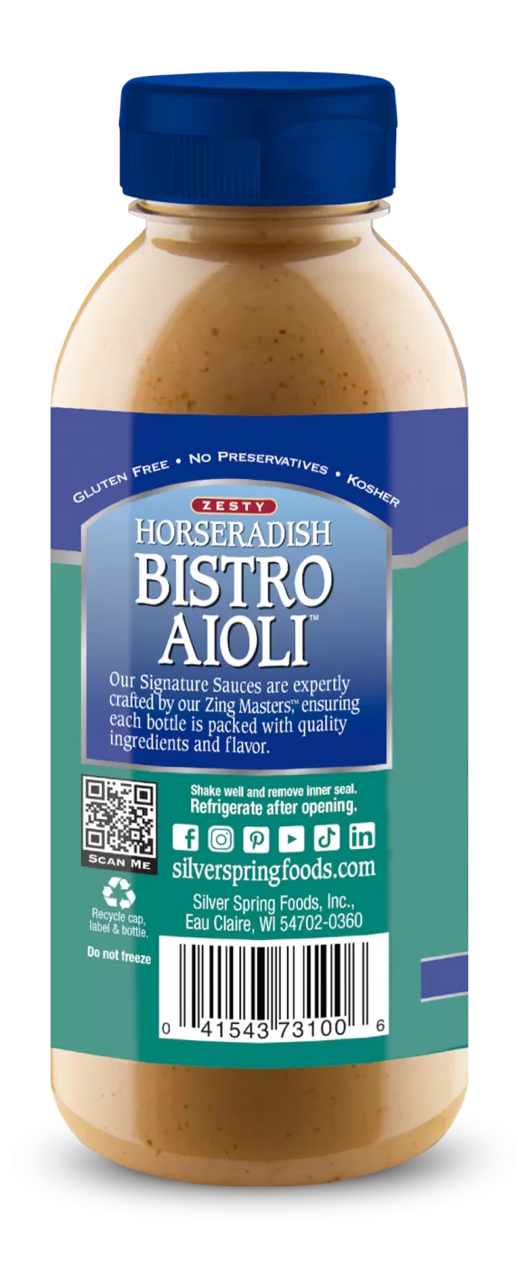 Indulge in the masterful blend of creamy and zesty flavors with our new Horseradish Bistro Aioli signature sauce. With a kick of horseradish and a sweet crunch of dill pickle relish, it's the ideal companion for roast beef, burgers, smoked salmon, and more!