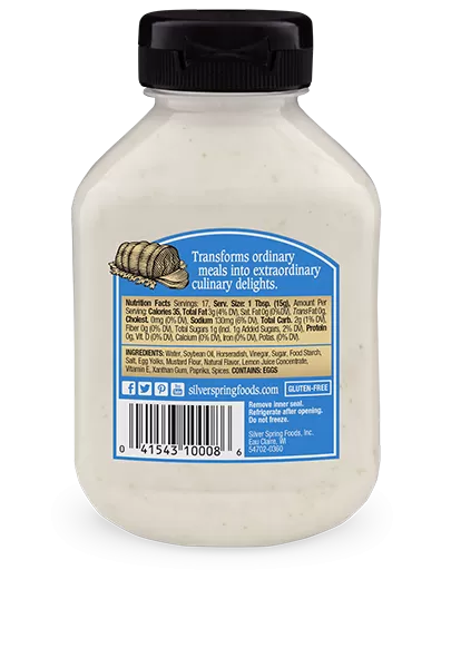 Our horseradish sauce can be described with one word: sassy! It has the sinus-clearing effects of our prepared horseradish, but it’s milder and creamier. The smooth consistency of this horseradish sauce makes it perfect for spreading on sandwiches and blending into other sauces. It’s delicious on roast beef and other meats. And you can dip your raw veggies into it for a slightly tart zing that makes healthy snacking easier and more enjoyable. Add a few fresh herbs to tailor the taste to suit whatever meal is on your plate. This versatile horseradish sauce might just become the most-loved condiment in your fridge! Gluten-Free product from Silver Spring.