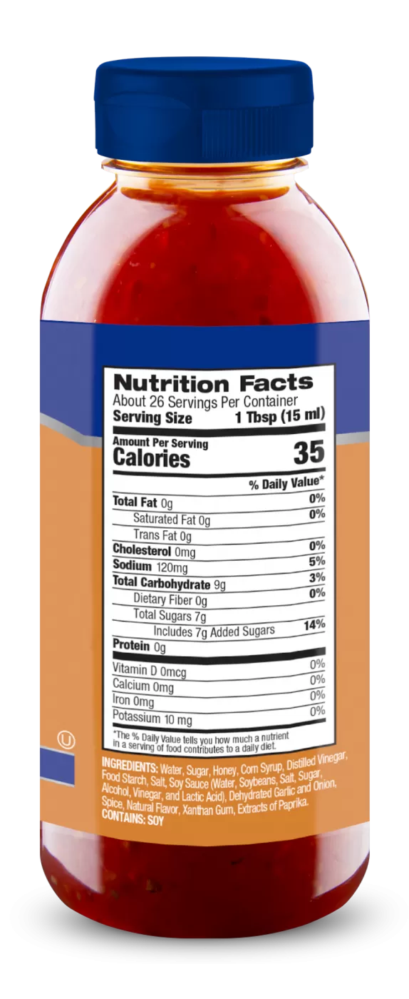 Water, Sugar, Honey, Corn Syrup, Distilled Vinegar, Food Starch, Salt, Soy Sauce (Water, Soybeans, Salt, Sugar, Alcohol, Vinegar, and Lactic Acid), Dehydrated Garlic and Onion, Spice, Natural Flavor, Xanthan Gum, Extracts of Paprika. CONTAINS: SOY