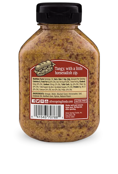 A coarse texture with a tangy, peppery bite while the subtle heat of fresh horseradish rounds out the finish.